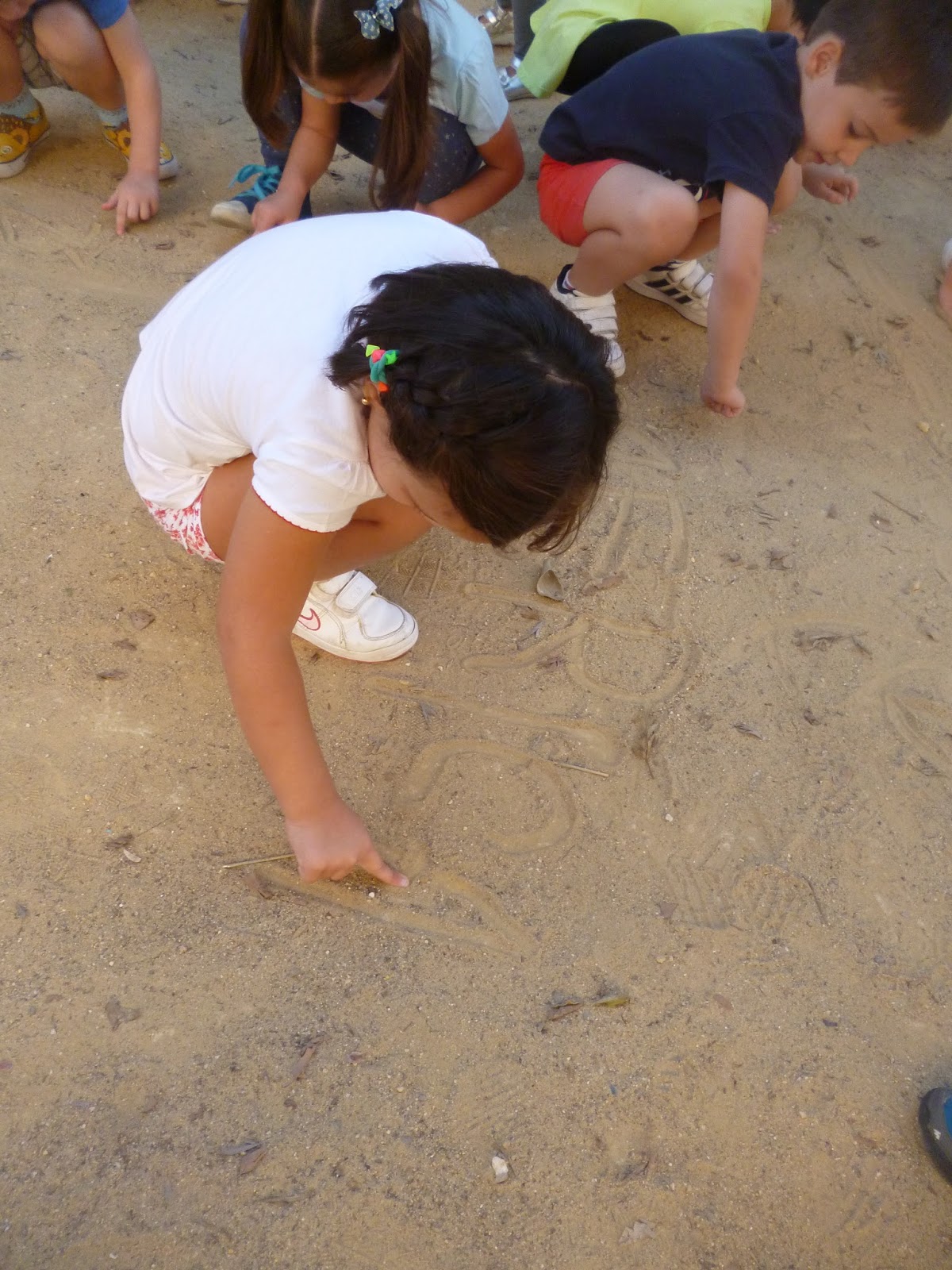 Como muy bien sabemos en la Luna no existe aire, no hay viento (idea que aportó el lunes Víctor), si dejamos marcada las huellas de nuestras pisadas, al no existir aire nada puede hacer quitar esas huellas...nosotros no estamos en la Luna así que a nuestra manera hemos vivenciado este hecho, hemos marcado en el suelo nuestros pies, hemos dibujado en la arena, hemos escrito nuestro nombre...y hemos echado aire..¡adios a nuestras huellas!